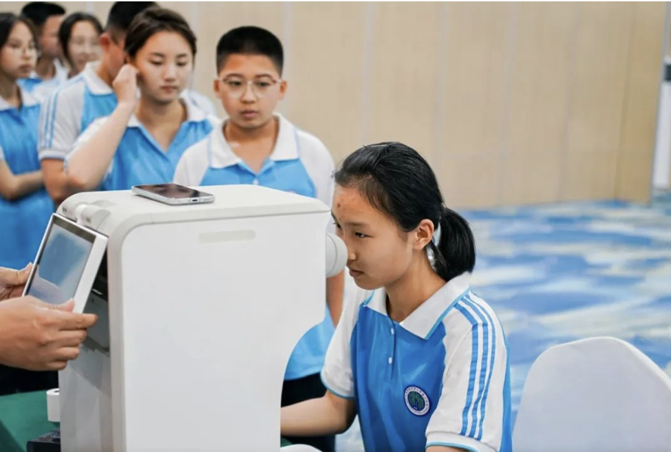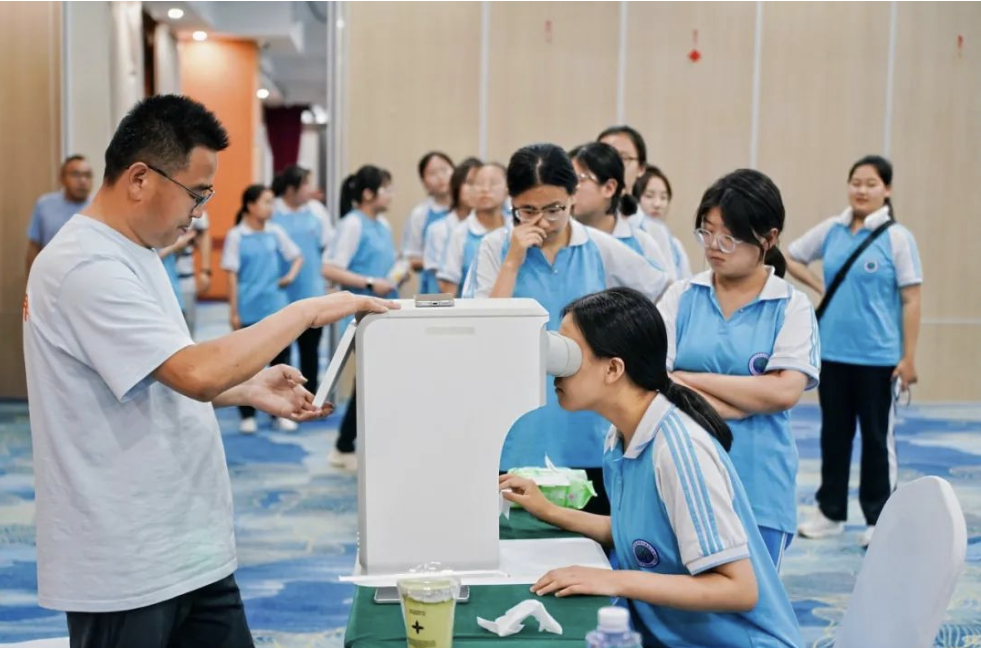 "同學別緊張,看鏡頭里的小紅點就好。" 醫護人員輕聲引導著。通過先進的 AI 輔助檢測技術,孩子們僅用 1至3 分鐘就完成了眼底拍照與初步評估,現場就能拿到包含視網膜健康狀況的檢測報告。"能快速發現有沒有近視引發的視網膜問題,太方便了!" 帶隊老師感慨地說。據介紹,此次篩查不僅關注近視防控,更能精準識別血管、神經類潛在眼部異常,為孩子們建立眼健康檔案提供了科學依據。